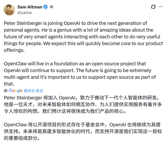 大家好啊,这个春节,AI圈太热闹了,2月16日,近期特别火爆的AI开源项目OpenClaw创始人Peter Steinberger将加入OpenAI公司。OpenAI首席执行官Sam Altman在X平台上发文称:“OpenClaw将作为开源项目保留在基金会中,OpenAI也会继续提供支持。”他补充道,Steinberger加入OpenAI的目标是“驱动下一代个人智能体(Personal Agents)的开发”。