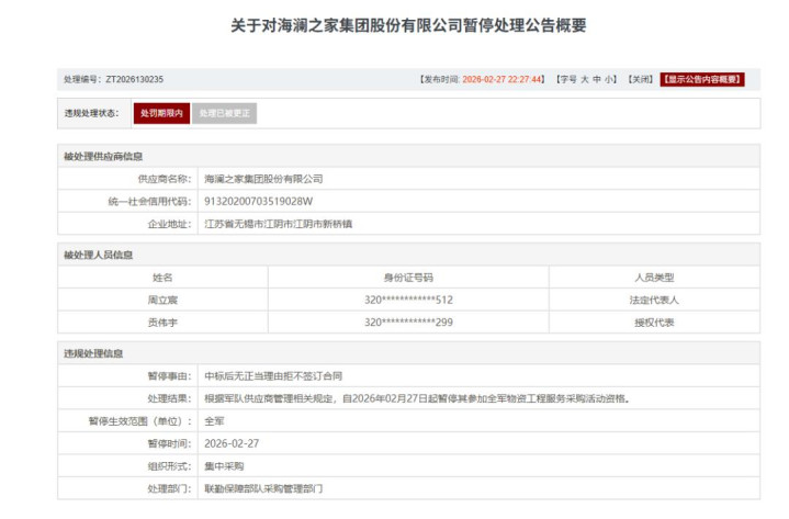 近日,军队采购网发布公告:海澜之家集团股份有限公司因“中标后无正当理由拒不签订合同”,被暂停参加全军物资工程服务采购活动资格,自2026年2月27日起生效。